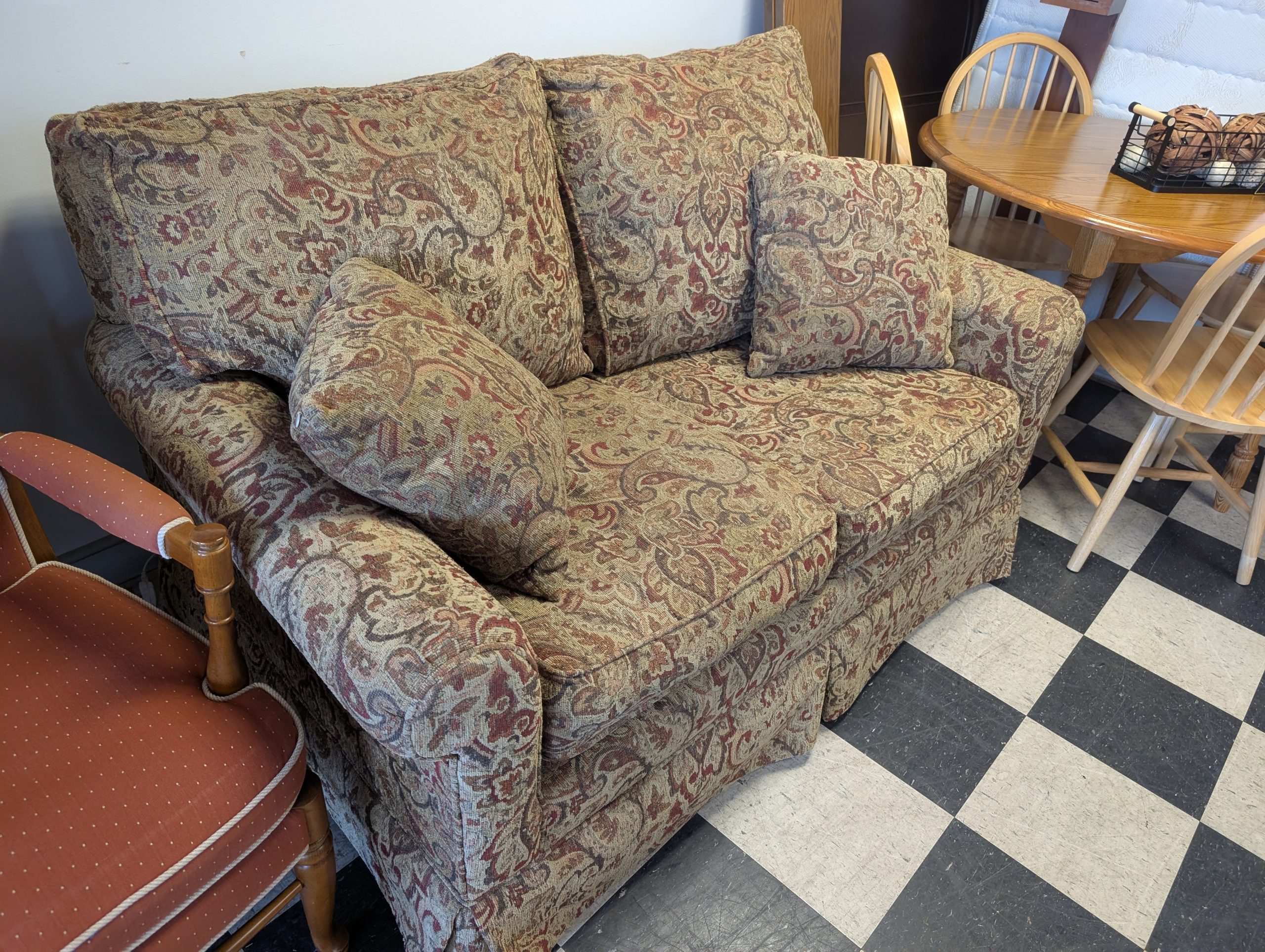 - Patterned upholstery with matching throw pillows